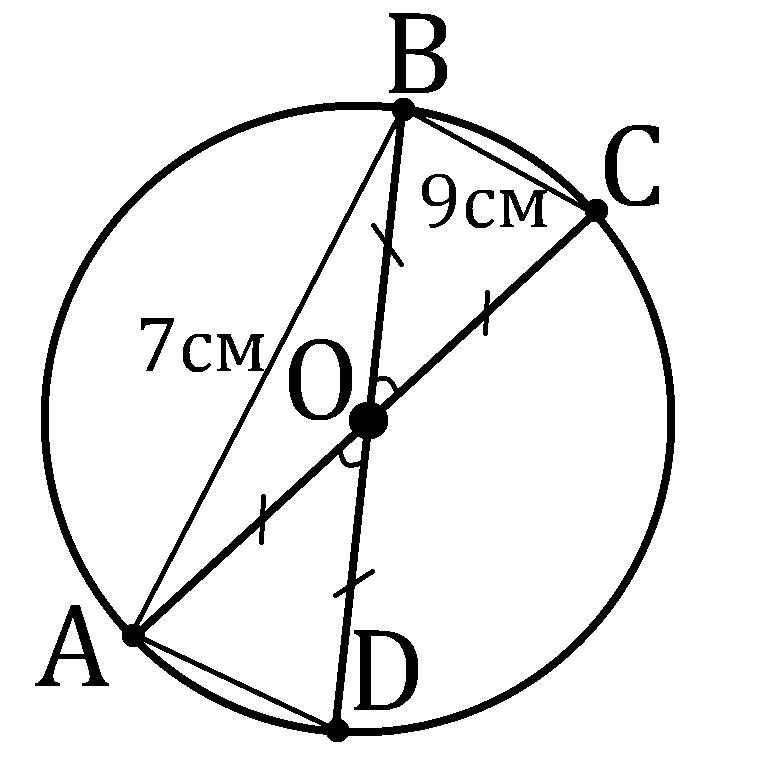В окружности с центром в точке О проведены диаметры AC и BD. Найдите хорду AD, если AB=7 см, CB=9 см. Срочно нужно.