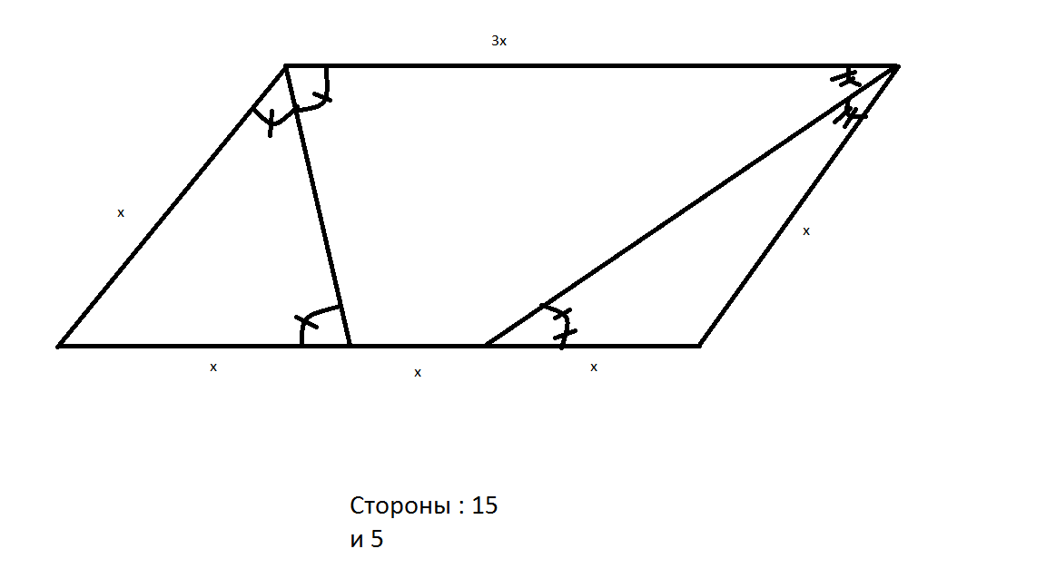 Из равенства углов при биссектрисе и накрест лежащих углов выходят равнобедренные треугольники. Из равенства углов при основании.