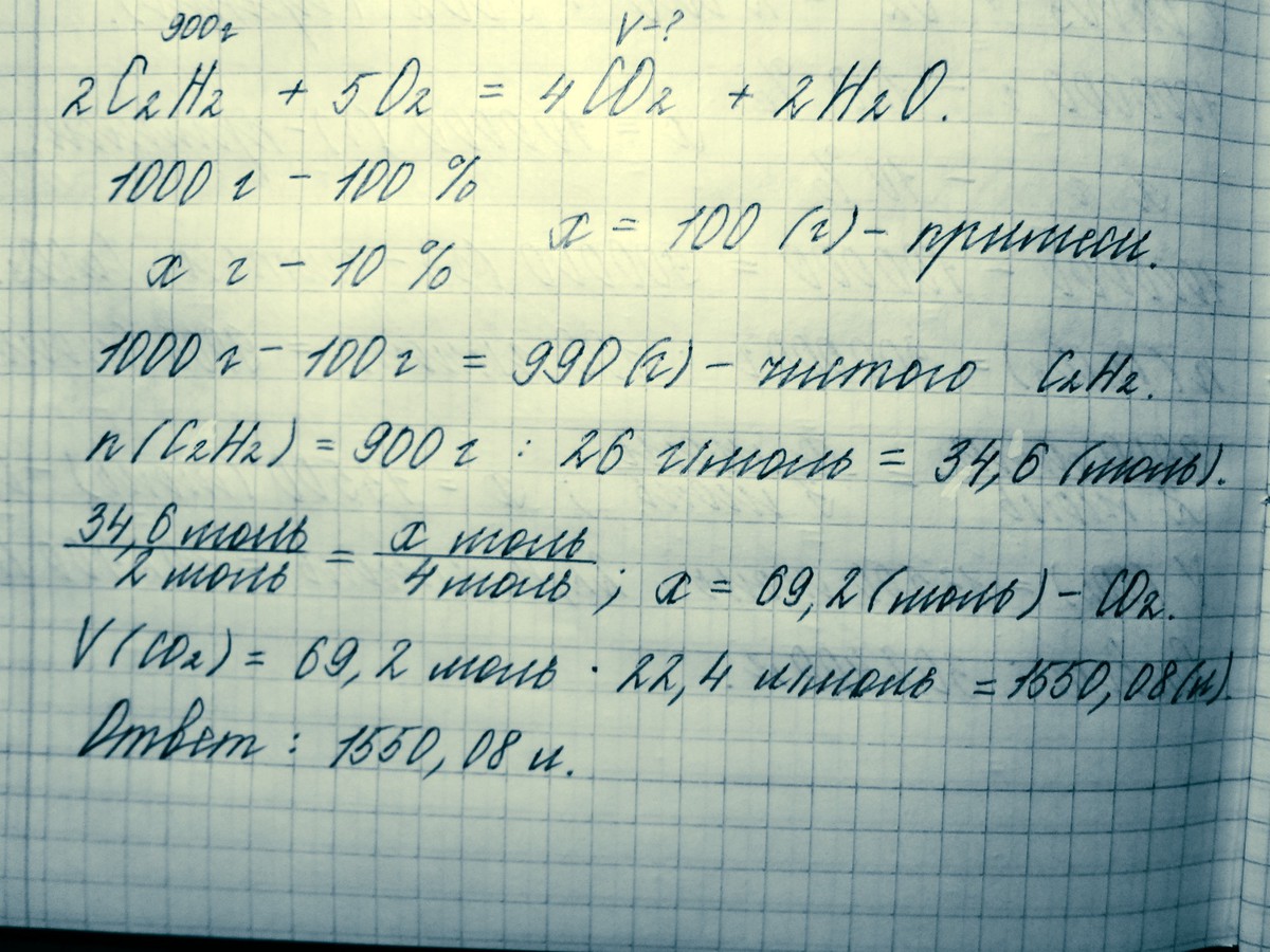 какой объем углекислого газа получится при полном сгорании ацетилена массой 1 кг содержащий 10% примесей