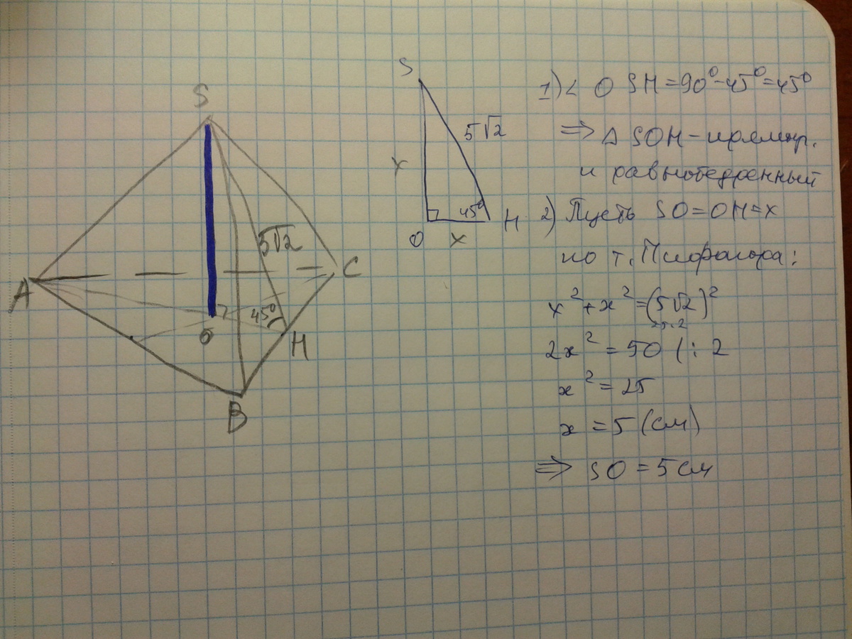 Угол между плоскостями боковой грани и основания правильной треугольной пирамиды равен 45 градусов. Длина апофемы равна 5 корень из 2(см).