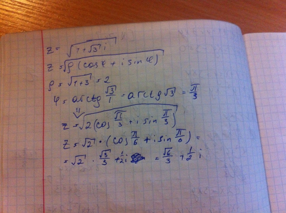 Если правильно помню, примерно вот так получится. Прошу прощения, cos(pi/6)=sqrt(3)/2, поэтому в итоге будет sqrt(6)/2 + i*1/2