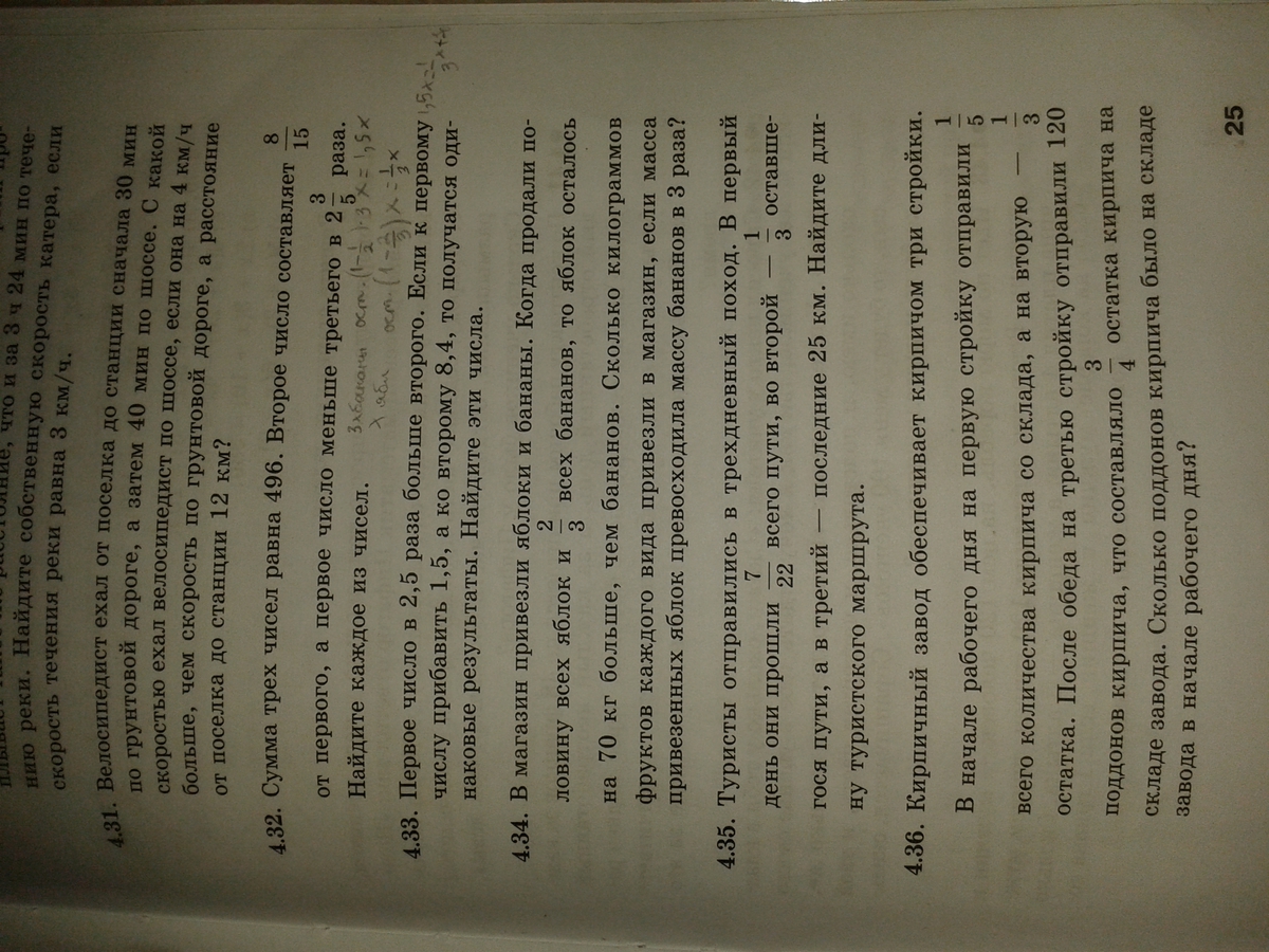 ну вот смотри: 120 кирпичей - это 3/4 часть от остатка, тогда 1 = 160 кирпичей - это то, что осталось после отправки на вторую стройку. Далее 1/3 от 160 - отправили на вторую стройку, тогда 1 = 240 кирпичей - это то, что осталось от отправки на первую. 1/5 - отправили на первую, значит 1 - это весь кирпич на складе, а 4/5 - это о что осталось после отправки на первую стройку. Получается, что 1 - это всегда целый остаток кирпичей, от которого отправляют часть кирпичей