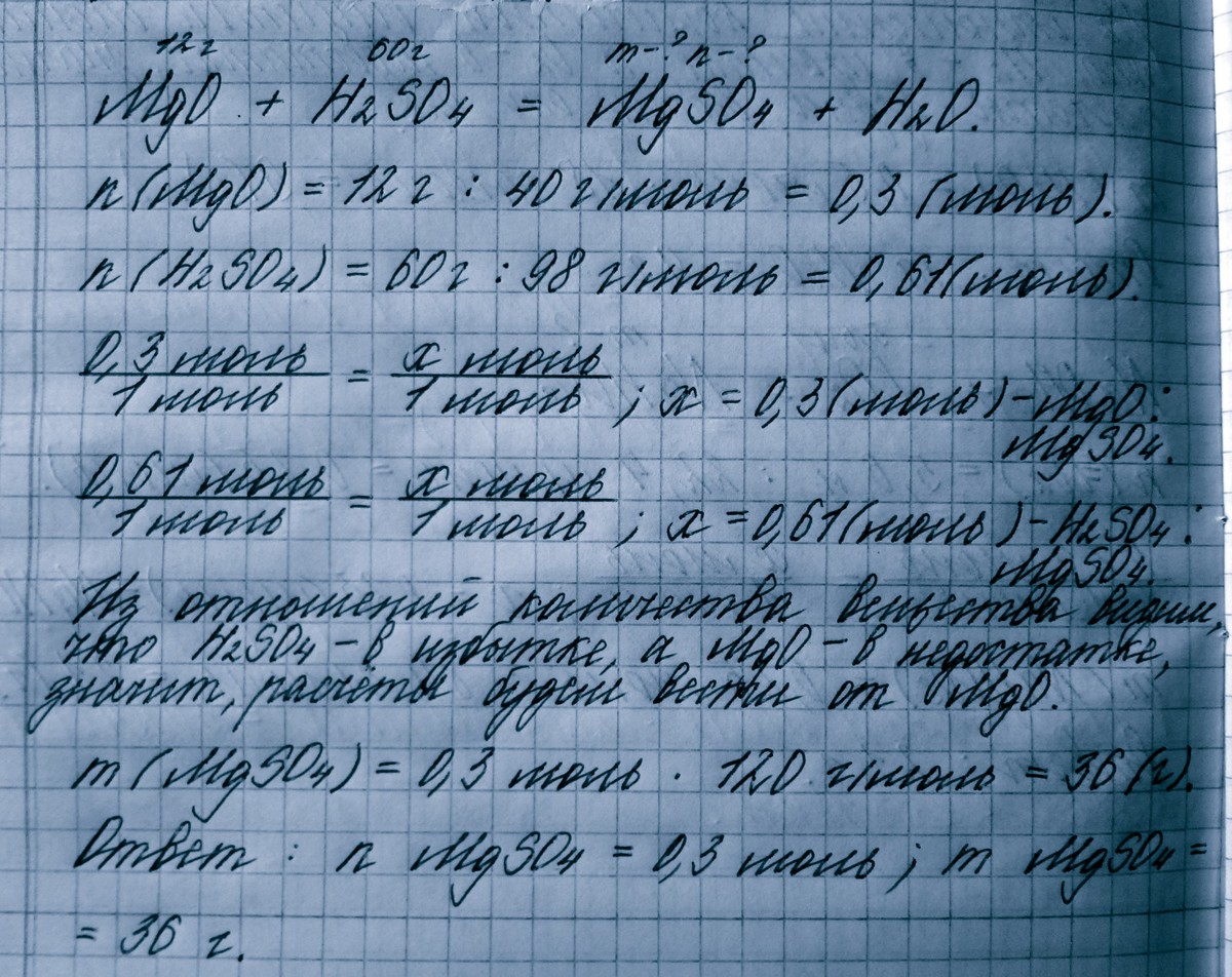 сколько соли образуется, если 12г оксида магния(MgO) обработали раствором, содержащим 60г серной кислоты(H2SO4)