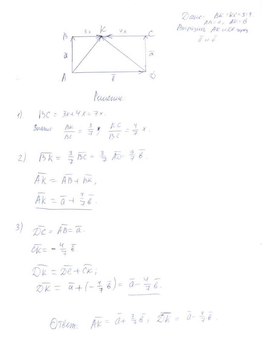 На стороне ВС прямоугольника АВСД отмечена точка К так, что ВК : КС = 3 : 4. Выразить вектор АК, вектор ДК, через векторы а = АВ и б = АД