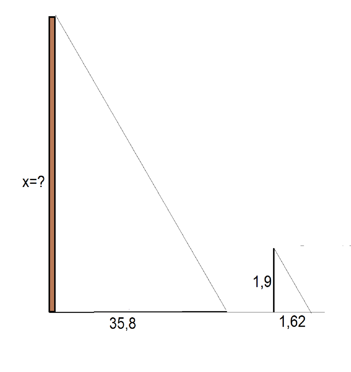 Длина тени фабричной трубы равна 35,8 м. В это же время вертикально воткнутый в землю кол высотой 1,9 м дает тень длиной 1,62 м. Найдите высоту трубы.