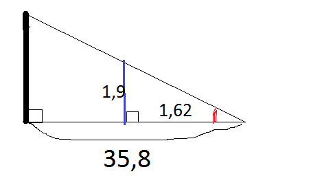 Длина тени фабричной трубы равна 35,8 м. В это же время вертикально воткнутый в землю кол высотой 1,9 м дает тень длиной 1,62 м. Найдите высоту трубы.