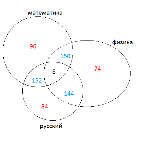 Тех, кто сдал один только предмет на 5 обозначила красным цветом. Их 96+74+84=254. Тогда тех кто получил хотя бы одну 254+150+152+132+8=696