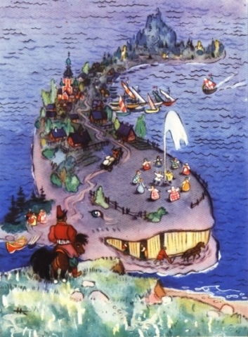 Рыба-кит - это особая рыба. В давние Времена, когда солнце было еще жарче, а люди еще добрее существовала целая стая рыб-китов. Они были особенными, они плавали по морям- океанам, рекам, протокам и горным озерам. Люди любили рыб-китов, одну яркую-голубую, особенно. Она приглянулась людям. Рыбаки уважали эту рыбу и не ловили. Эта рыба несла на своей спине целые деревни и города, все это можно увидеть по иллюстрации Н.Кочергина.