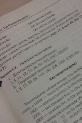 количественные:three, five,eleven, twelve, thirteen, twenty-four. sixty nine, three hundred and twenty-five,one thousand five, five hundred thirty,four hundred and twenty-five. Порядковые:the first, the second, the fifteenth, twenty-third, eighty-fourth, one-hundred-and-forty-ninth, one-hundred-and-five tenth, (208-не знаю),the thousandth,two million