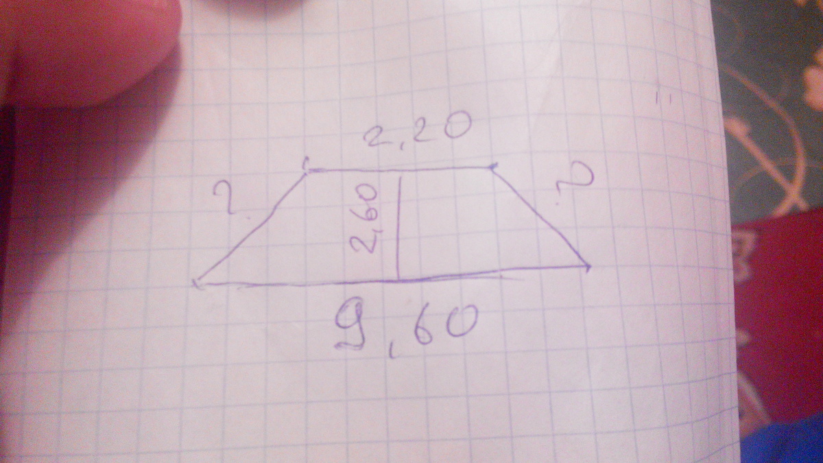 S=(a+b)·h/2=(2.2+9,2)·2,6/2=11,4·2,6/2=14,82 кв. ед