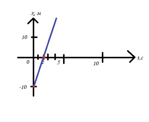 Нужно подставить в уравнение x=-10+5t вместо t 2 секунды. Получим: х=-10+5·2=0м