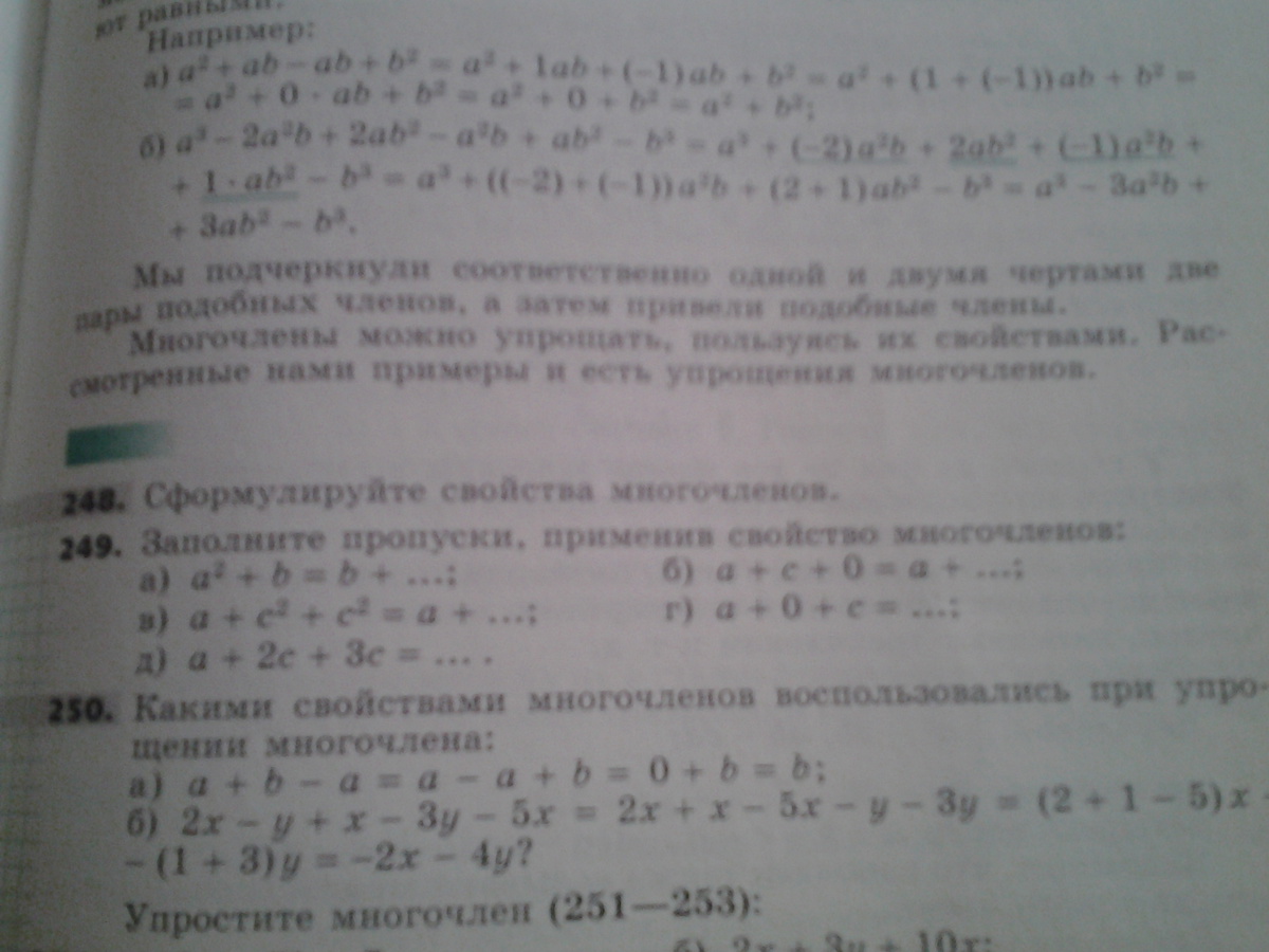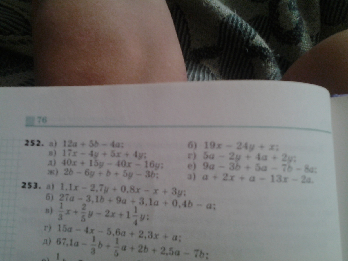 252 :а) 8а + 5b, в) 22х ,д) -у,ж)-у, б)20х-24у, г)9а, е)-10b-6а, з)-11х всё 249 не знаю