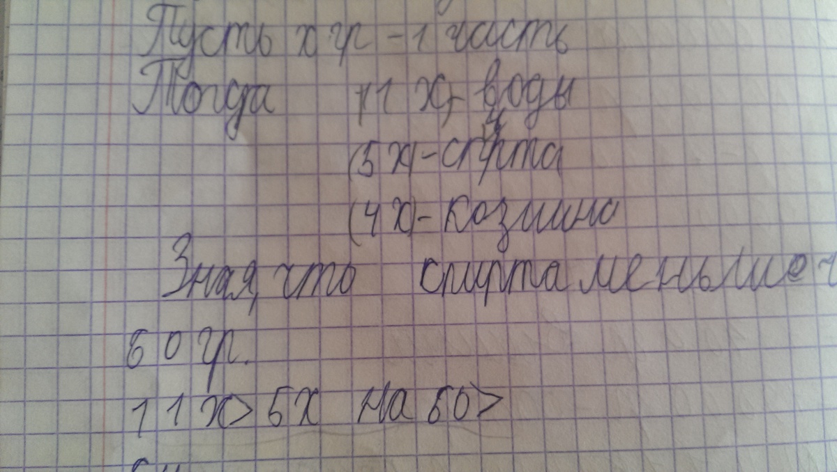 воды ,5 частей нашатырного спирта,и 4 ч.казеина .сколько получится клея,если нашатырного спирта на 60г.больше чем воды
