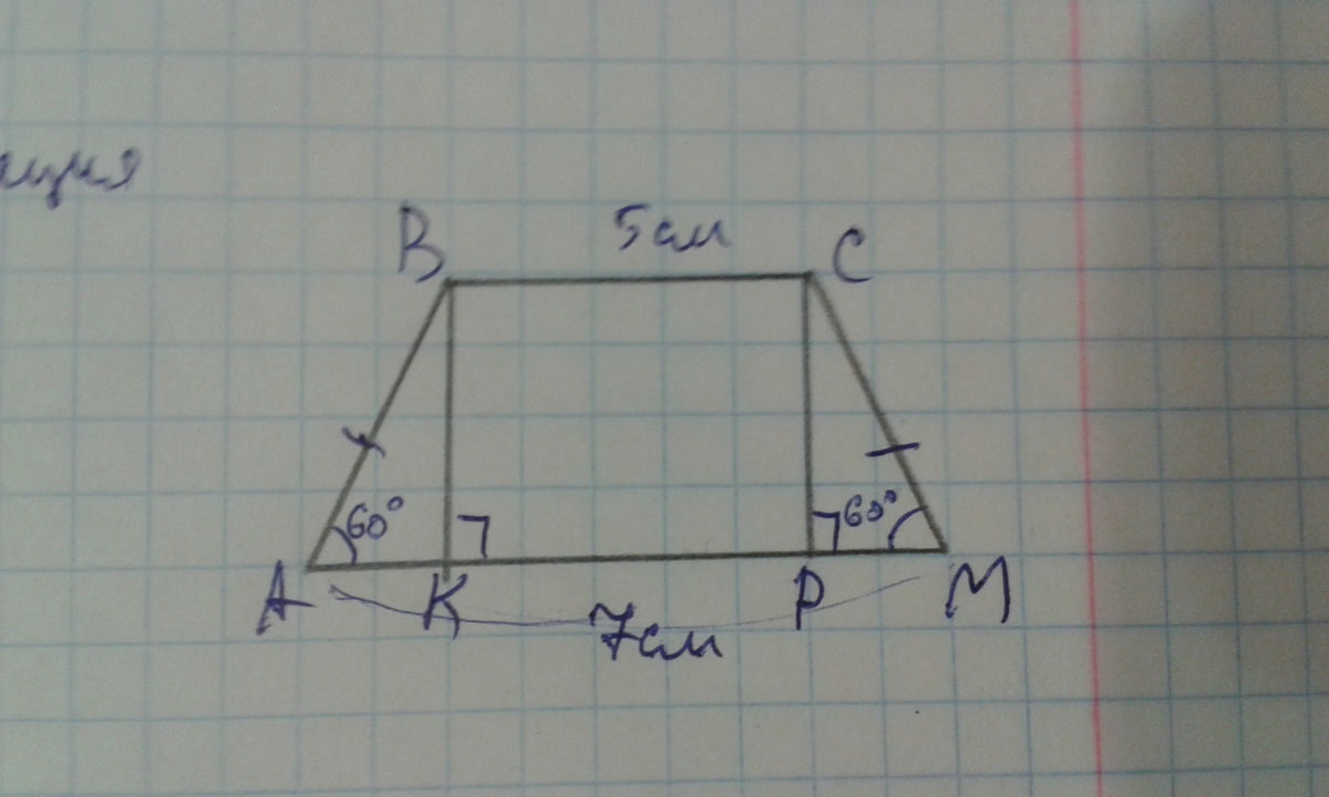 1) Так как АВСМ - р/б трапеция, то АК=СР = (АМ-ВС):2, РМ=1 см