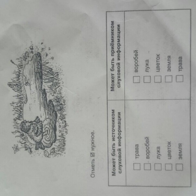 Источником слуховой информации может быть воробей, трава (если по ней идти или её будет качать ветер), лужа (если в ней будет плескаться вода), а приемником слуховой информации может быть только воробей, как живое существо, обладающее слухом.
