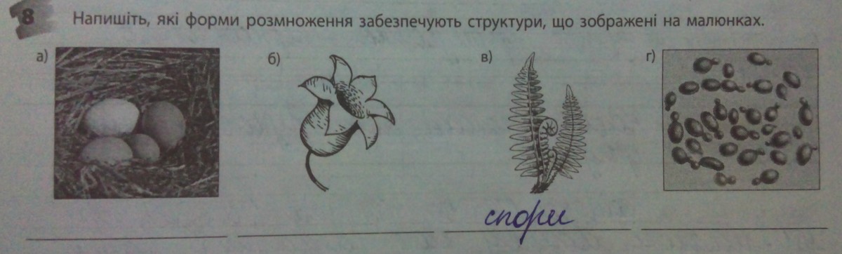 Напишіть, які форми розмноження забезпечують структури, що зображені на малюнках.