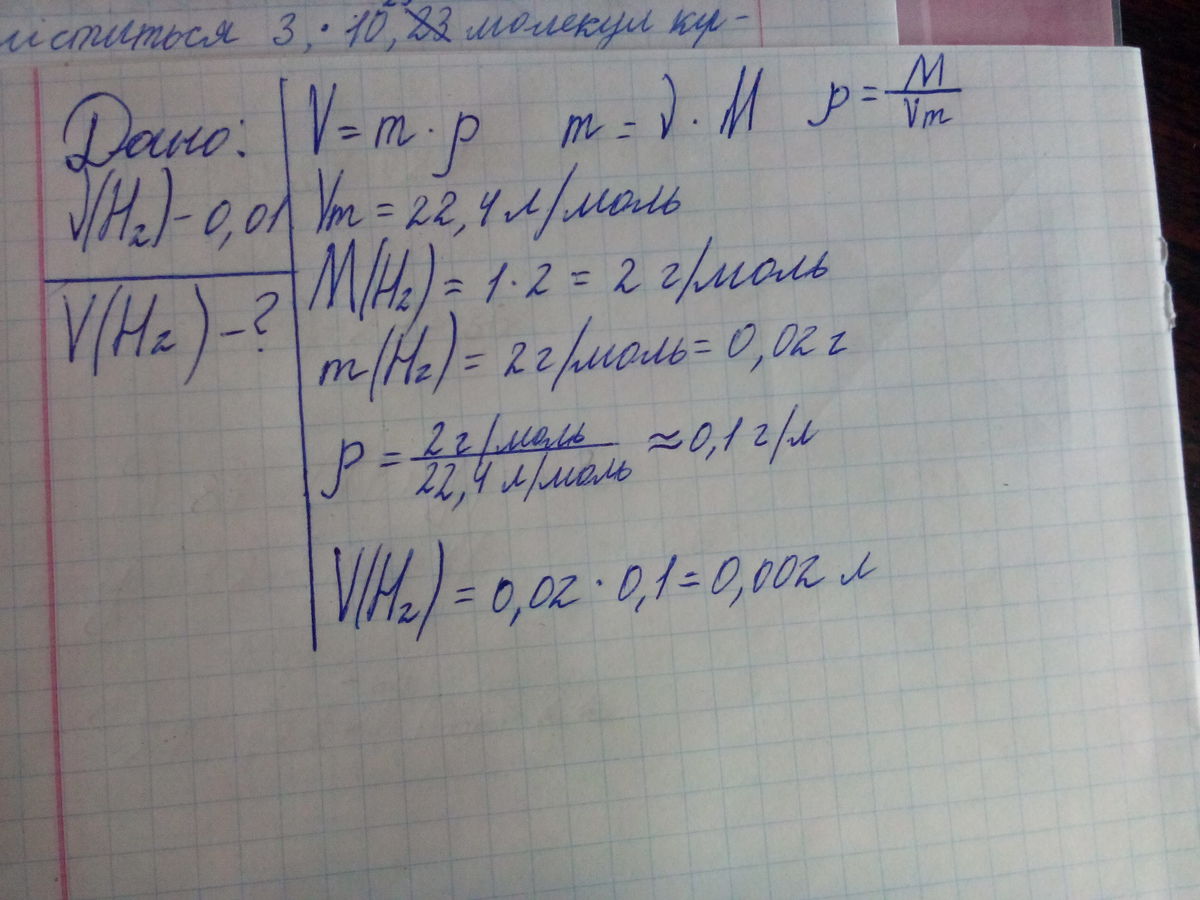 V (H₂) = 0,01 моль · 22,4 л/моль = 0,224 (л)
