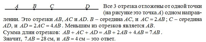 На прямой от одной точки в одном направлении отложены три отрезка так, что конец первого отрезка служит серединой второго, а конец второго - серединой третьего. Найдите длину меньшего отрезка, если сумма длин всех сторон равна 28 см.