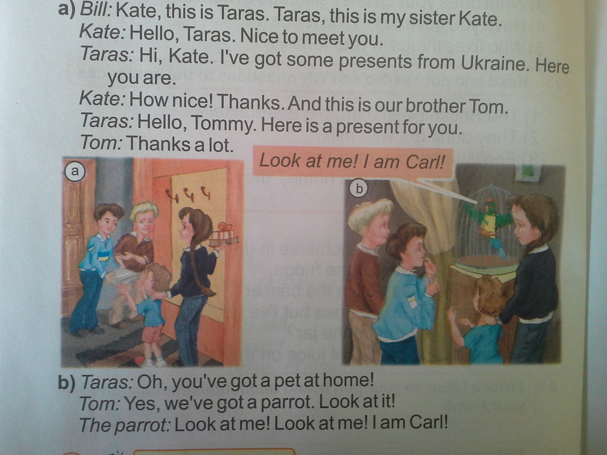 катя это тарас,тарас это моя сестра катя -привет тарас,рада встретить тебя -привет катя,я принес несколько подарков с Украины. -как прекрасно!спасибо.А это наш брат Том - привет томи,здесь есть подарок для тебя -спасибо большое