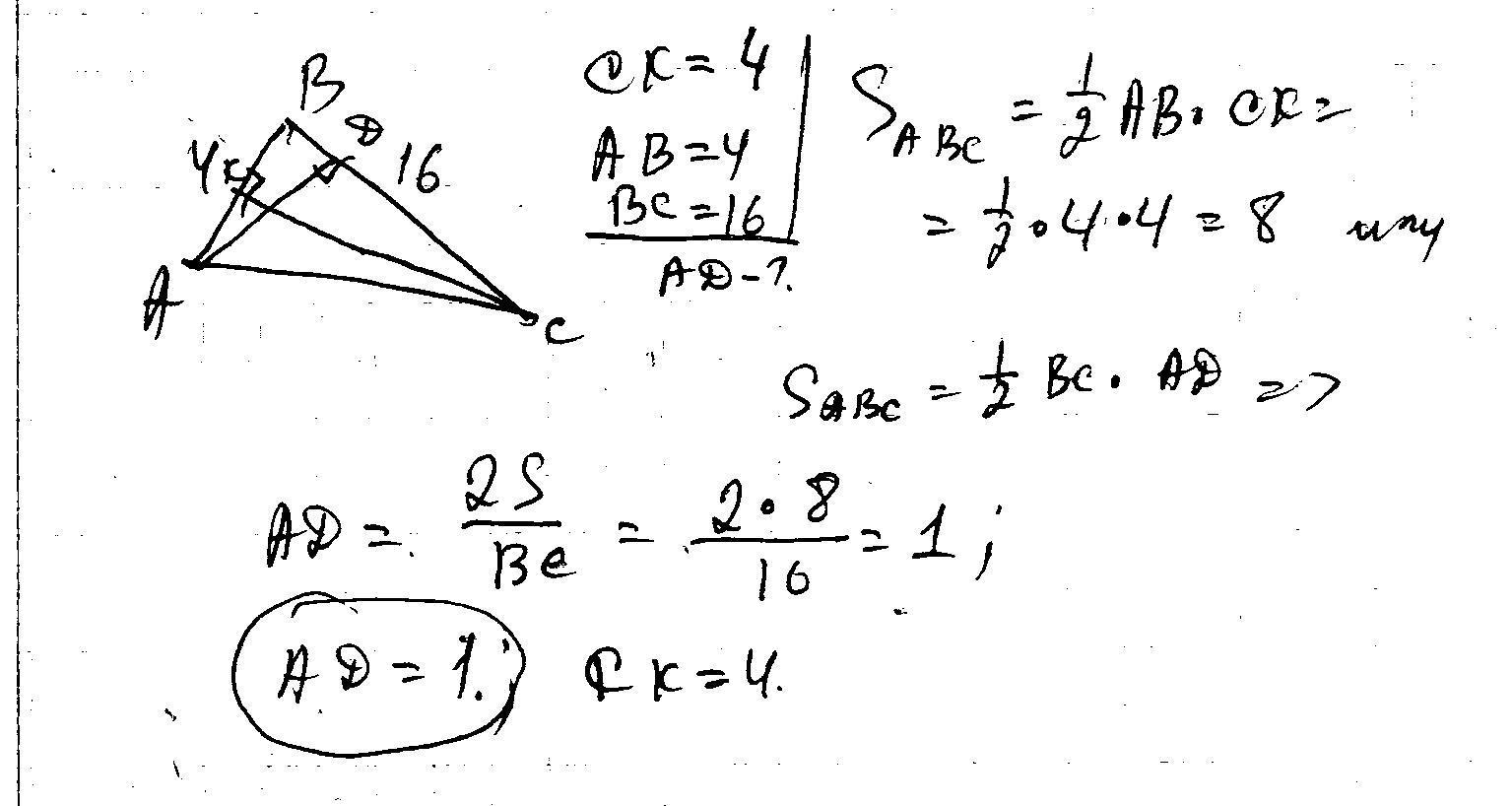 У треугольника со сторонами 4 и 16 проведены высоты к этимсторонам. Высота, проведенная к первой стороне, равна 4. Чему равна высота, проведенная ко второй стороне?