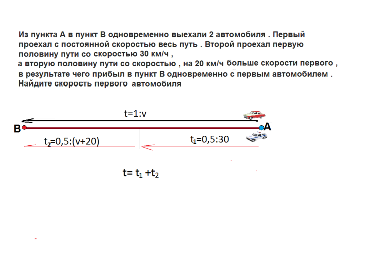 Из пункта A в пункт B одновременно выехали 2 автомобиля . Первый проехал с постоянной скоростью весь путь . Второй проехал первую половину пути со скоростью 30 км/ч , а вторую половину пути со скоростью , на 20 км/ч больше скорости первого , в результате чего прибыл в пункт B одновременно с первым автомобилем . Найдите скорость первого автомобиля