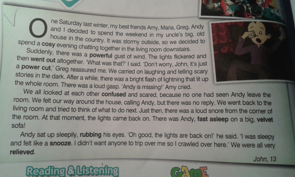 Вдруг мы услышали мощный порыв ветра. Лампочки вспыхнули и погасли совсем. "Что это было?' - сказал я. "Не волнуйся. Джон, просто выключилось электричество,' - успокоил меня Грег. Мы смеялись и рассказывали страшные истории в темноте. Через некоторое время была яркая вспышка молнии, которая осветили всю комнату. Раздался громкий вздох. "Энди нет!’ - закричала Эми.