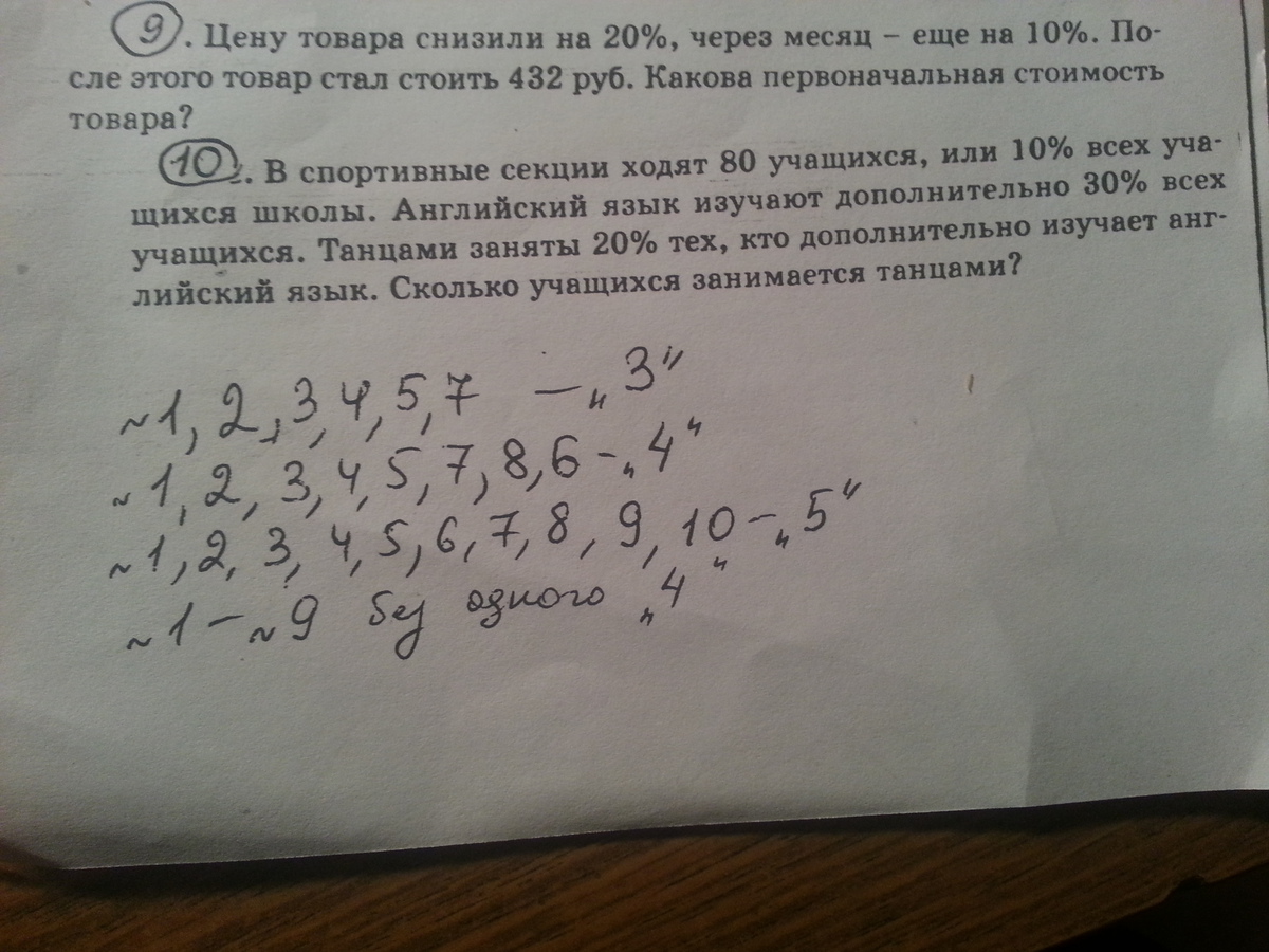 № 9. пусть х руб. первоначальная цена, тогда 20% - 0,2х, после первой уценки х-0,2х=0,8х рублей. после второй уценки 0,1*0,8х=0,08х рублей. Значит, 0,8х-0.08х=432, 0,72х=432, х=600 рублей первоначальная цена.