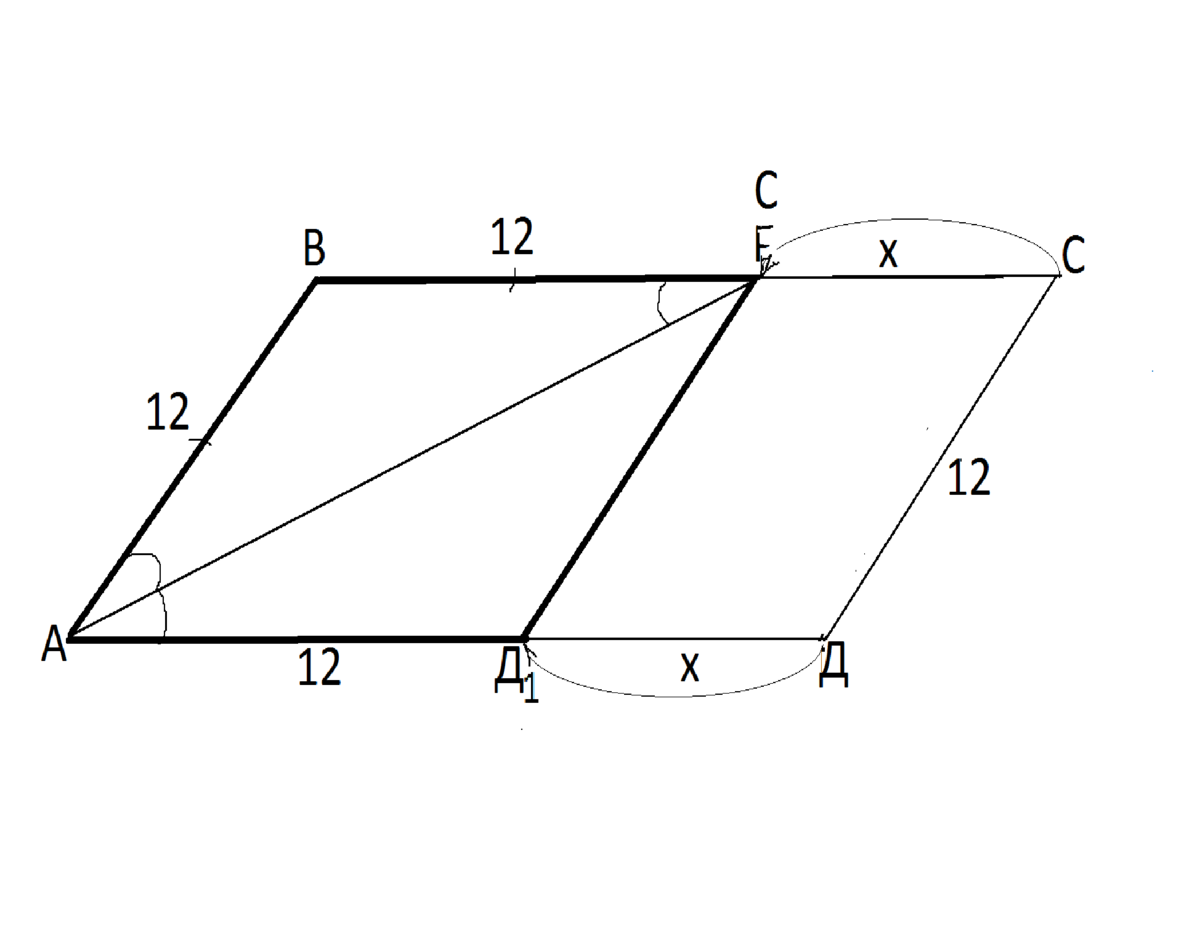 Отсюда следует, что Е совпадает с вершиной С, а Д1 совпадает с вершиной Д параллелограмма, АД=12, и этот параллелограмм - ромб.