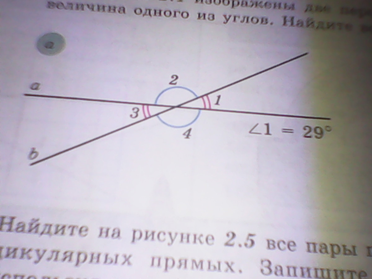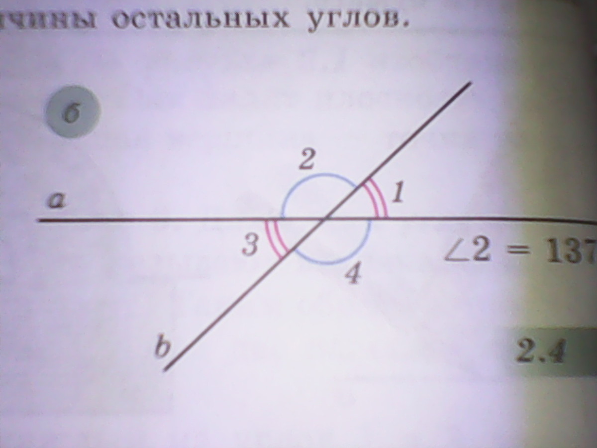 На рисунке 2.4 изображены две пересикающиеся прямые a и b и задана величина одного из углов.Найдите величины остальных углов.