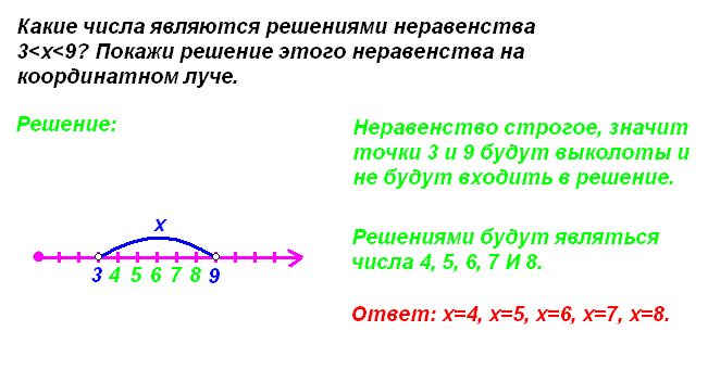 Какие числа являются решениями неравенства 3<х<9? Покажи решение этого неравенства на координатном луче.