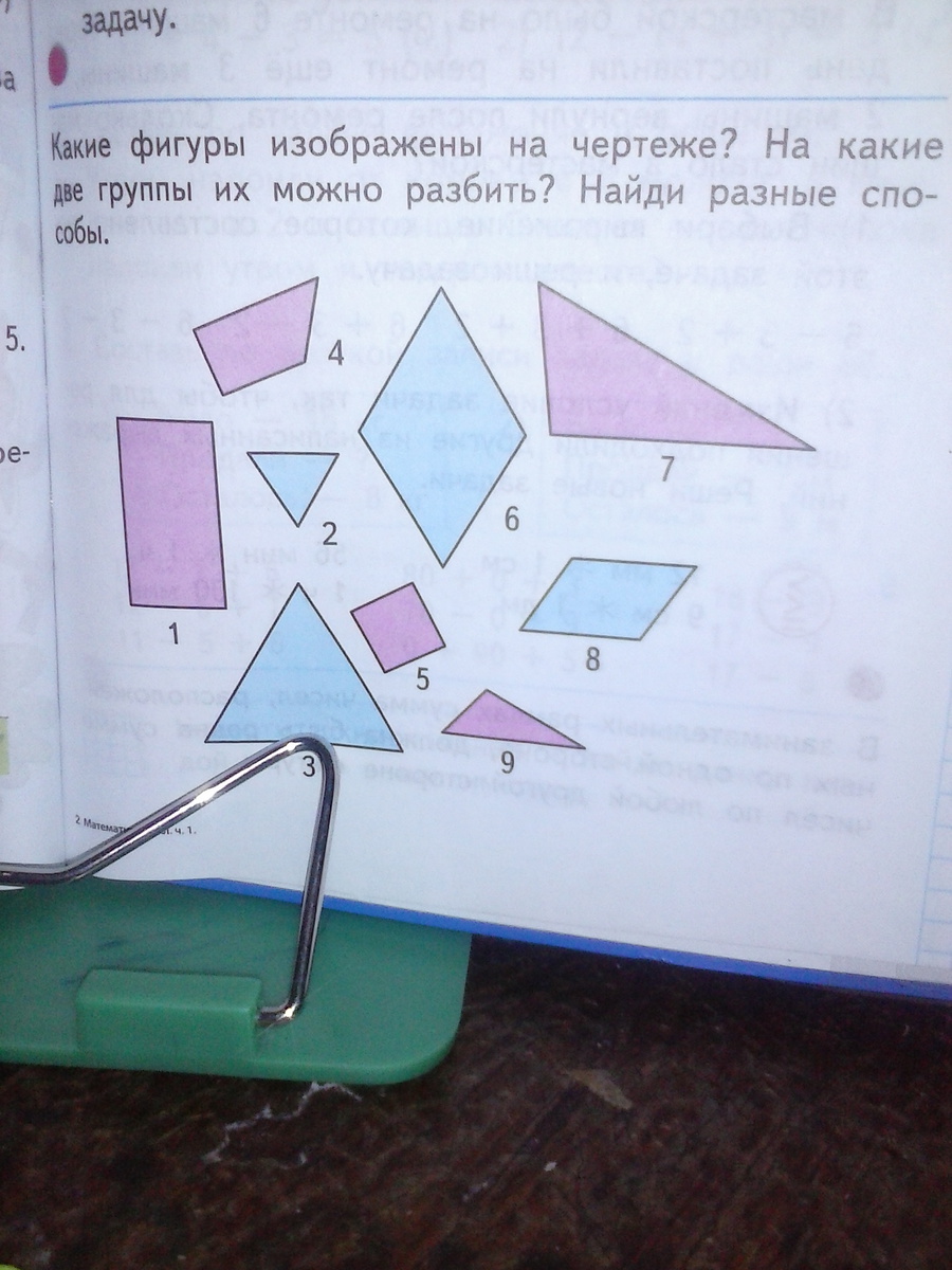 какие фигуры изображены на чертежи? на какие две группы их можно разбить? найди разные способы.