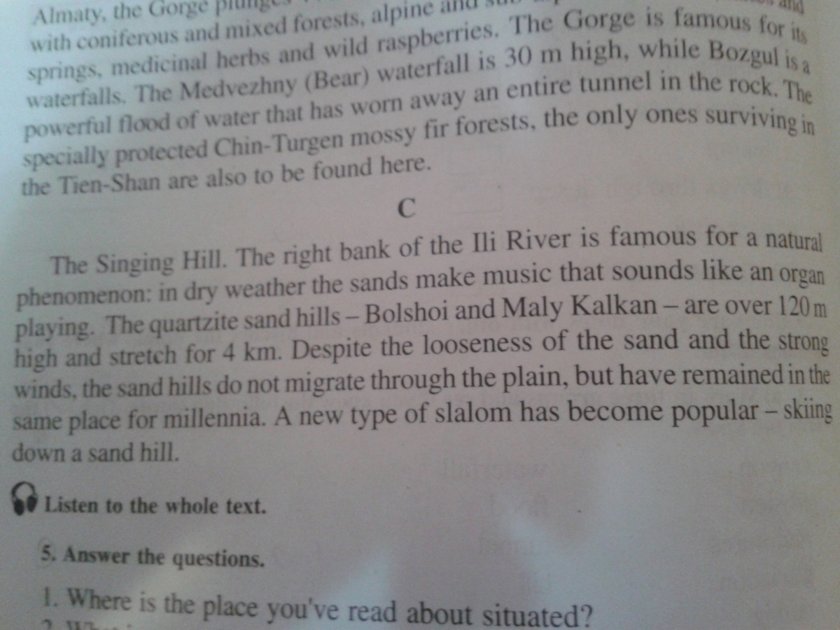 Поющий Холм. Правый берег Илистой реки знаменит натуральным феноменом. В сухую погоду песок издаёт звуки как поющий орган. Песочные холмы - Большой и Малый Калкан около 120 м в высоту и тянутся 4 км. Несмотря на теряемость песка и сильные ветры, песочные холмы не рассыпаются по долине, а остаются на одном месте тысячалетие.