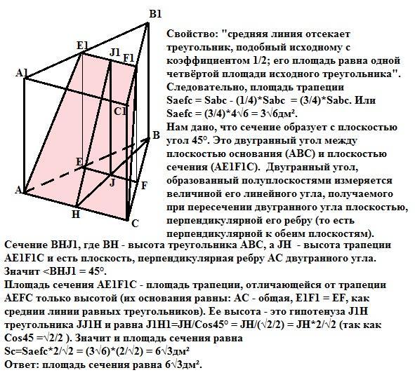 Площадь основания прямой треугольной призмы равна 4 корень из 6 дм в квадрате.Найдите площадь сечения призмы, проведенного через сторону одного основания и параллельную ей среднюю линию другого основания, если известно, что сечение образует с плоскостью угол 45 градусов.