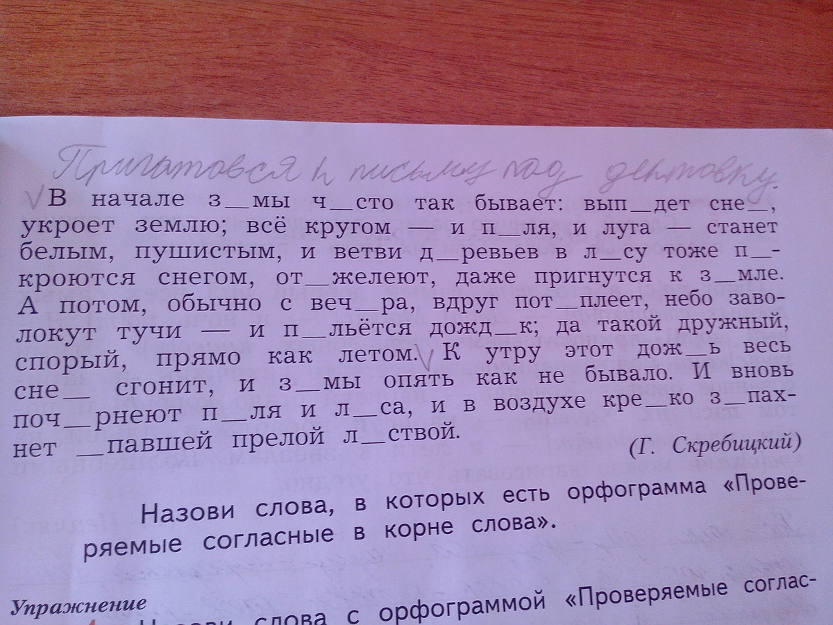 зИмы,(корень); чАсто,(корень); выпАдет, (корень); снЕг(корень); пОля(корень); дЕревьев(корень); в лЕсу(корень); пОкроются(приставка); отжелтеют(приставка); к зЕмле(корень); с вечЕра(корень); потЕплеет(корень); пОльётся(приставка); дождИк(суффикс); дожДь(корень); почЕрнеют(корень); лЕса(корень); креПко(корень); зАпахнет(корень); опАвшей(корень); лИствой(корень). В скобках написано в какой части слова пропущена буква.