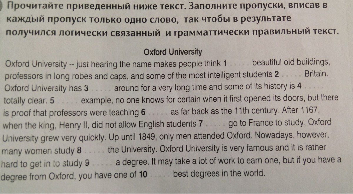 Oxford University -- just hearing the name makes people think 1 about beautiful old buildings, professors in long robes and caps, and some of the most intelligent students 2 in Britain. Oxford University has 3 history around for a very long time and some of its history is 4 totally clear. 5 For example, no one knows for certain when it first opened its doors, but there is proof that professors were teaching 6 students as far back as the 11th century. After 1167, when the king, Henry II, did not allow English students 7 to go to France to study. Oxford University grew very quickly. Up until 1849, only men attended Oxford. Nowadays, however, many women study 8 at the University. Oxford University is very famous and it is rather I hard to get in to study 9 for a degree. It may take a lot of work to earn one, but if you have a degree from Oxford, you have one of 10 the best degrees in the world.