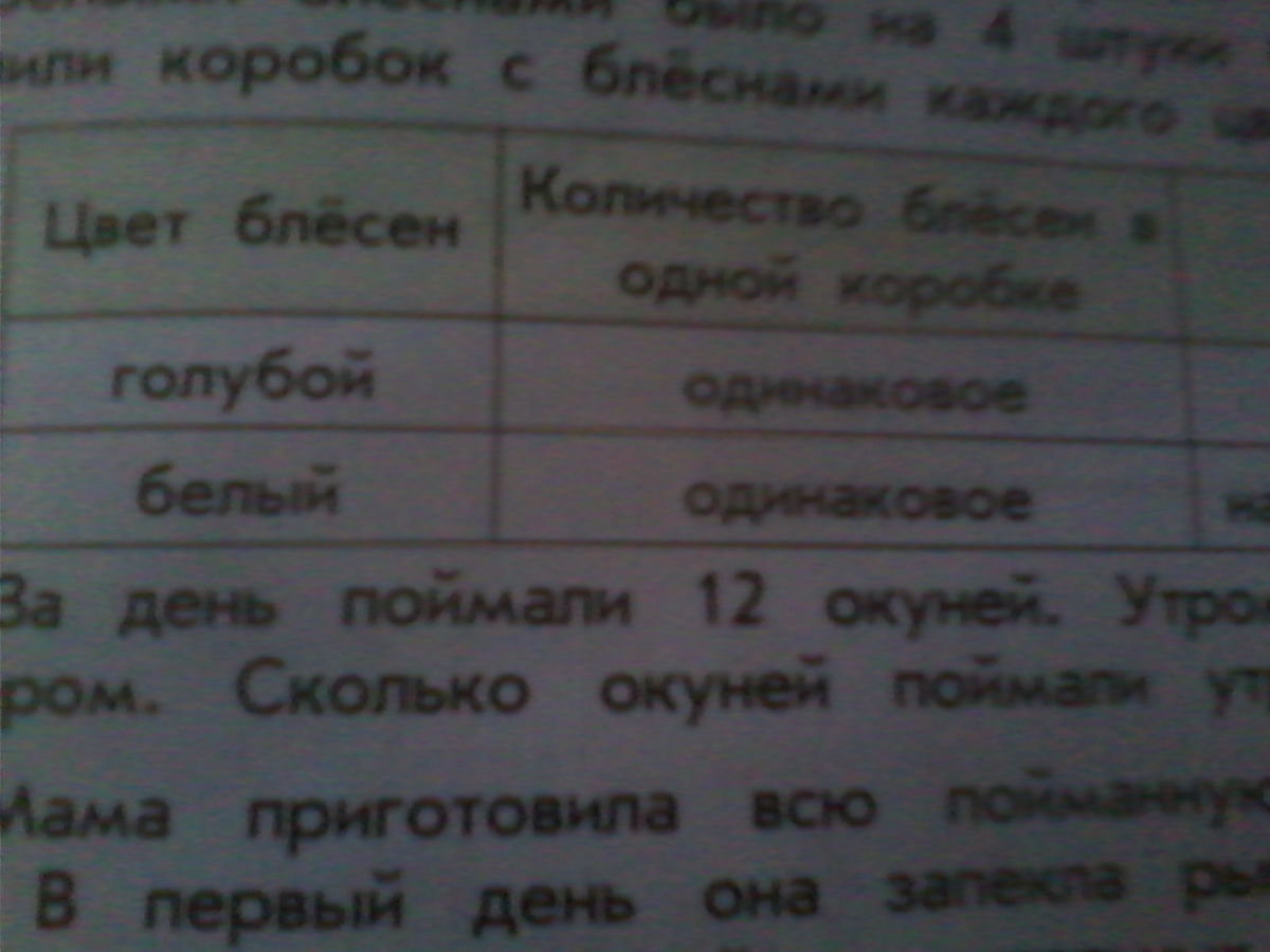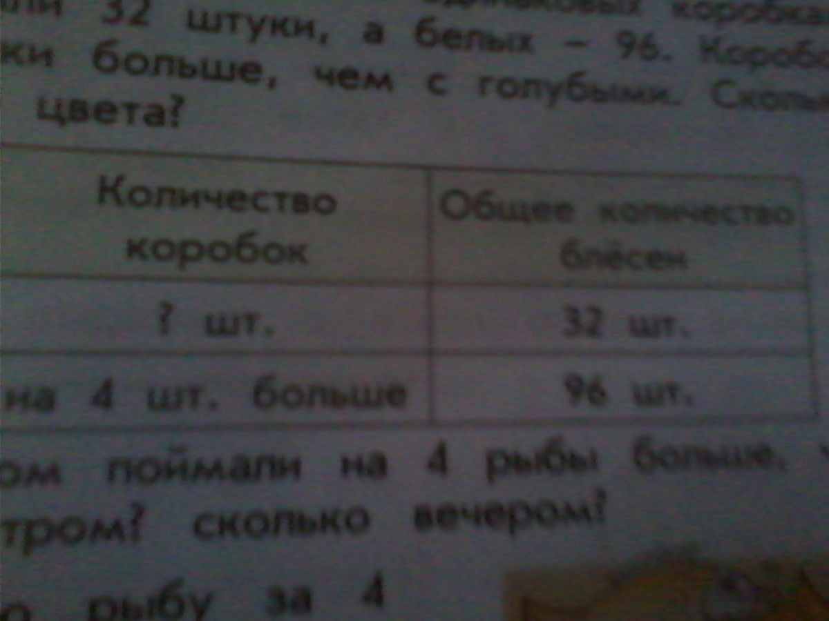 Для рыбалки купили голубые и белые блёсны в одинаковых коробках.Оказалось , что голубых блёсен купили 32 штуки, а белых 96. Коробок с белыми блёснами было на 4 штуки больше, чем с голубыми.Сколько купили коробок с блёснами каждого цвета?