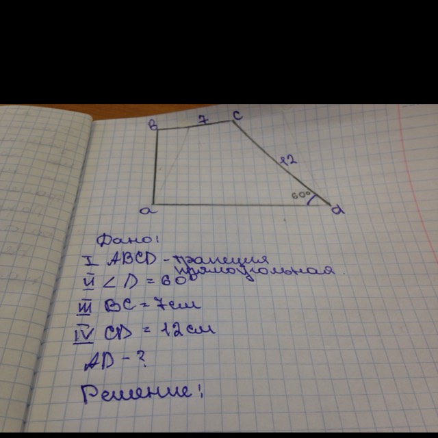 Из токи С ведешь перпендикуляр N на основание AD. По признаку треугольника находишь ND=6 см Так как ты провел перпендикуляр AN=BC=7см