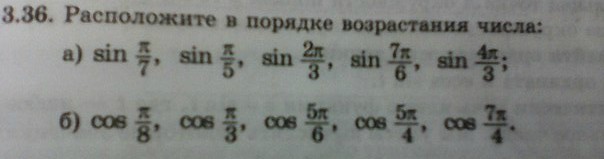 б) cos п/8; cos п/3; потом cos 5п/4 и cos 7п/4 равны; cos 5п/6.