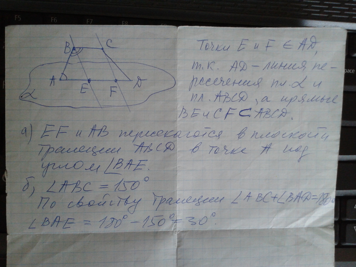 . я создала)) Основание АD трапеции АВСD лежит в плоскости α. Через точки В и С проведены параллельные прямые, пересекающие плоскость α в точках Е иF соответственно.а). Каково взаимное расположение прямых ЕF и АВ?б). Чему равен угол между прямыми ЕF и АВ, если АВС = 150