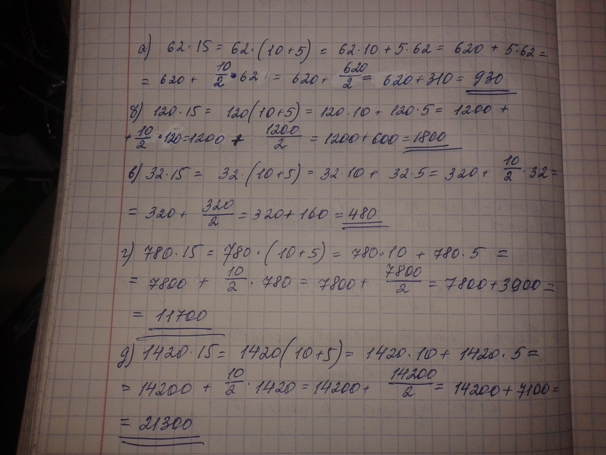 Например: 42*15=42*(10+5)=420+210=630. Вы видите, что этот же результат можно было получить, приписав в числу 42 справа нуль и прибавив половину полученного числа.Пользуясь этим приёмом, выполните умножение на 15 чисел.а) 62; б) 120; в) 32; г) 780 д) 1 420