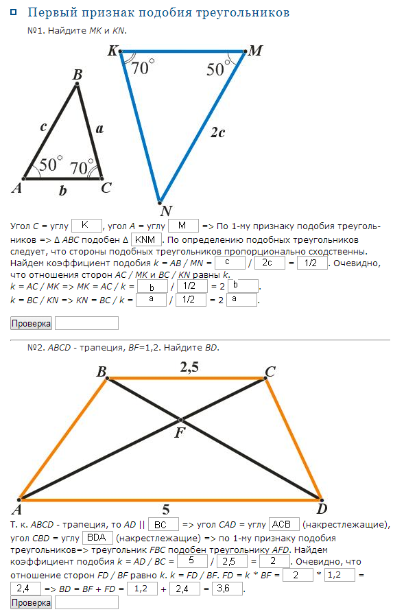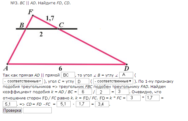 Ответ в приложенных рисунках. Но в последнем (3) примере - в учебнике ОПЕЧАТКА. Треугольники FBC и FAD подобны. Из их подобия имеем соотношение: AD/BC = FD/FC = 3 (а не СD/FC), откуда FD=3*FC = 3*1,7 = 5,1. CD=FD-FC=5,1-1,7 = 3,4.