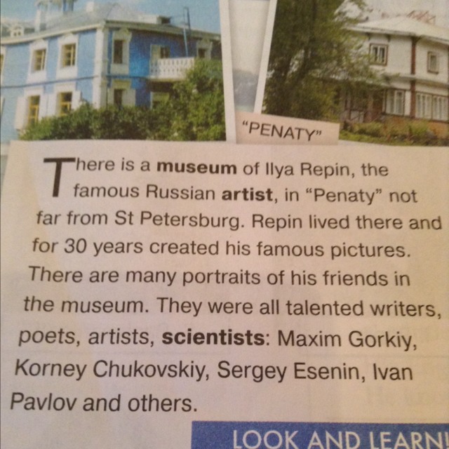 Музей Ильи Репина, известного российского художника, в "Пенаты" недалеко от Санкт-Петербурга. Репин жил здесь и около 30 лет создавал свои известные работы. В музее есть много портретов его друзей. Это талантливые писатели, поэты, художники, ученые: Максим Горкий, Корней Чуковский, Сергей Есенин, Иван Павлов и другие.