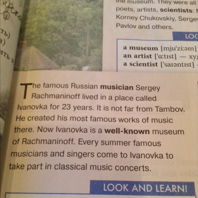 Известный российский музыкант Сергей Рахманинов жил в месте под названием Ивановко 23 года. Это недалеко от Тамбова. Свои лучшие работы он создавал здесь. Сейчас Ивановко хорошо известный музей Рахманинова. Каждое лето известные музыканты и певцы приезжают в Ивановко, чтобы принять участие в классическом музыкальном концерте.