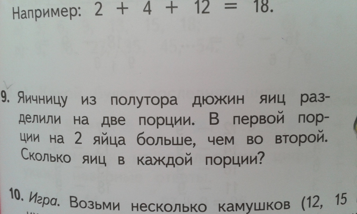 нарисовать кружок .поделить поровну в первой половинке напишите 2 порции а вовтором пешите на 2 яйца знак больше и стрелку от знака в первую половинку