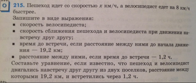 Т. к. скорость пешехода х км/ч, то скорость велосипедиста будет (х+8) км/ч.  скорость сближения пешехода и велосипедиста при движении на встречу друг другу будет такой х+(х+8)=2х+8 (км/ч) время до встречи если расстояние между ними до начала движения ---19,2км будет таким 19,2 : (2х+8) ч   расстояние между ними если время до встречи---1,2ч будет 1,2*(2х+8) км Составим уравнение  1,2*(2х+8) =19,2 Решим его: 2х+8=19,2 : 1,2, откуда 2х+8=16, 2х=8, х=4.Значит, скорость пешехода 4 км/ч, а велосипедиста - 12 км/ч