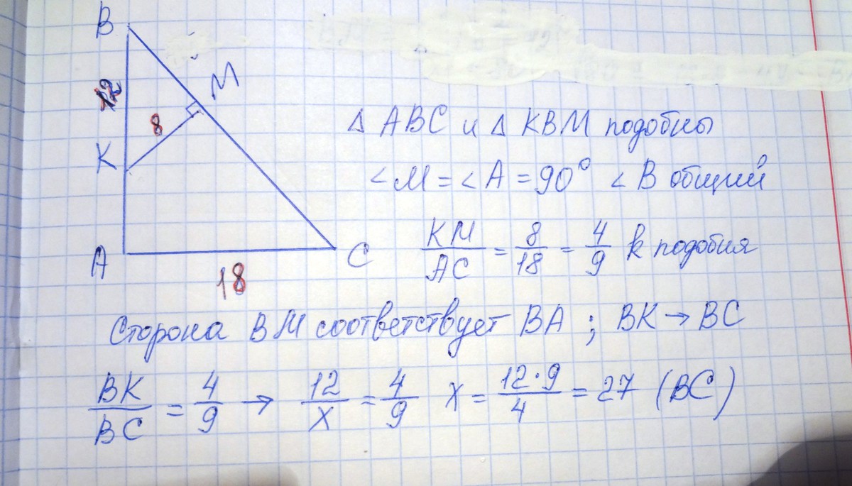 Через точку К катета АВ прямоугольного треугольника АВС проведена прямая перпендикулярная гипотенузе ВС и пересекающая ее в точке М. Вычислите длину гипотенузы треугольника АВС, если АС=18см, КМ=8см,ВК=12см