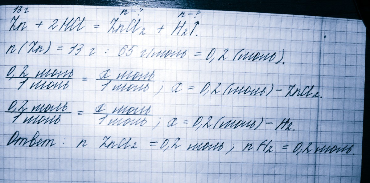 Цинк массой 13 г растворили в избытке соляной кислоты. Рассчитайте количество вещества выделившегося водорода образовавшегося хлорида цинка, ПОМОГИТЕ СРОЧНО!!!