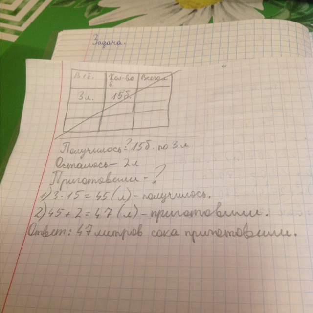 Помогите решить задачу, если разберёте мой почерк) а сама задача вот: приготовленный из ягод сок разлили в банки. Получилось 15 банок, по 3 л в каждой, и ещё осталось 2 л сока. Сколько литров сока приготовили?