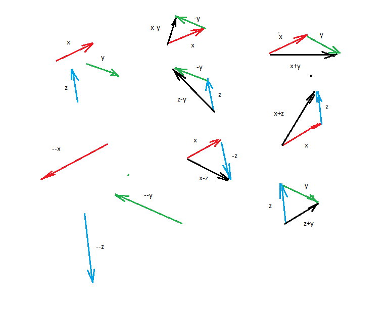 постройте векторы х-у , z-y , x-z, --х, --у,--z.