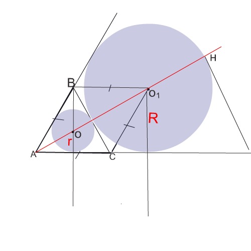 Найти радиус окружности вписанной в равносторонний треугольник со стороной 1. И радиус вневписанной(которая касается одной стороны треугольника и продолжения двух других сторон. Пример вневп.окружности в прямоугольном треугольнике во вложении пардон за кривоту) окружности такого же треугольника. Без формул. Формулы еще не проходили.
